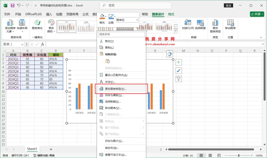 5、第二步,插入组合图,在图表空白处右击选择【更改图表类型】;