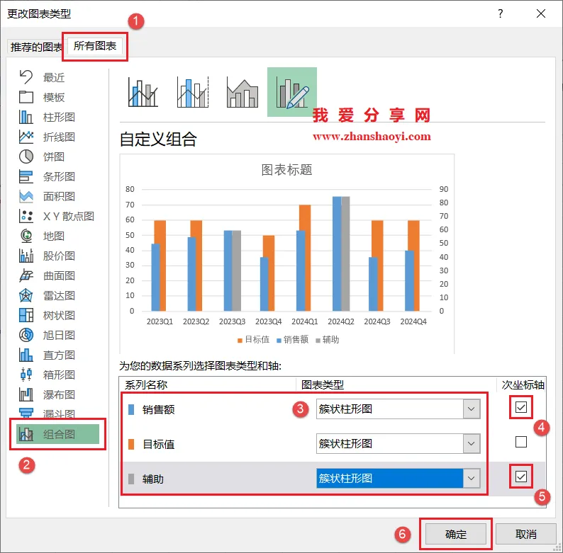 6、打开如下对话框,先点击【所有图表】,按照下图修改图表类型,注意:必须将销售额系列和辅助系列放置在次坐标轴,否则销售额柱形会被目标值柱形遮挡,无法正常显示,然后点击【确定】生成新图表;