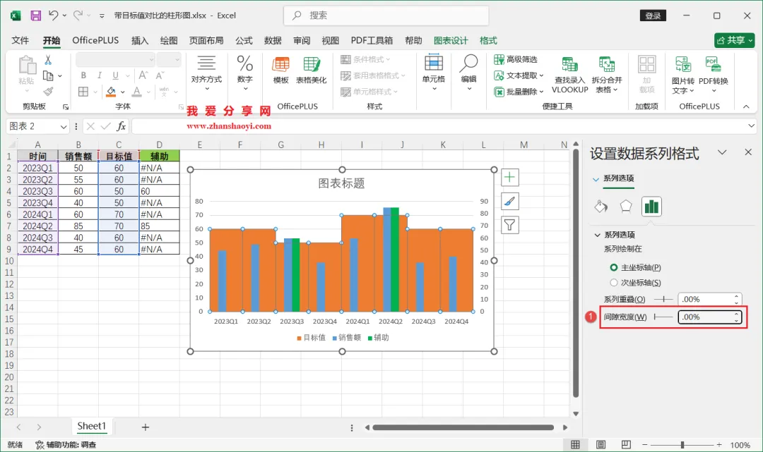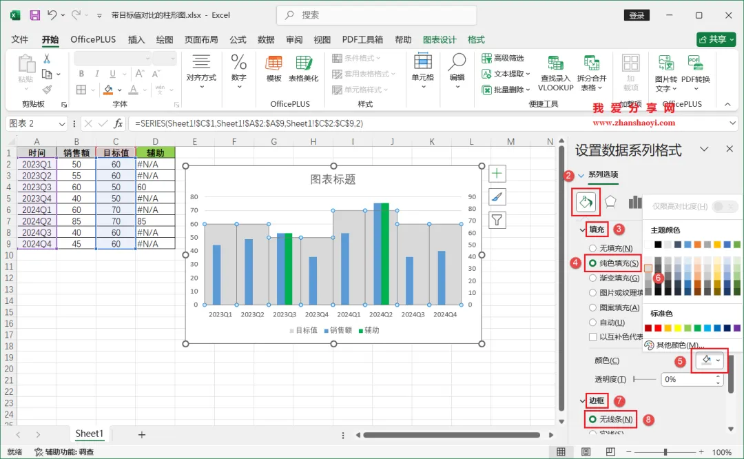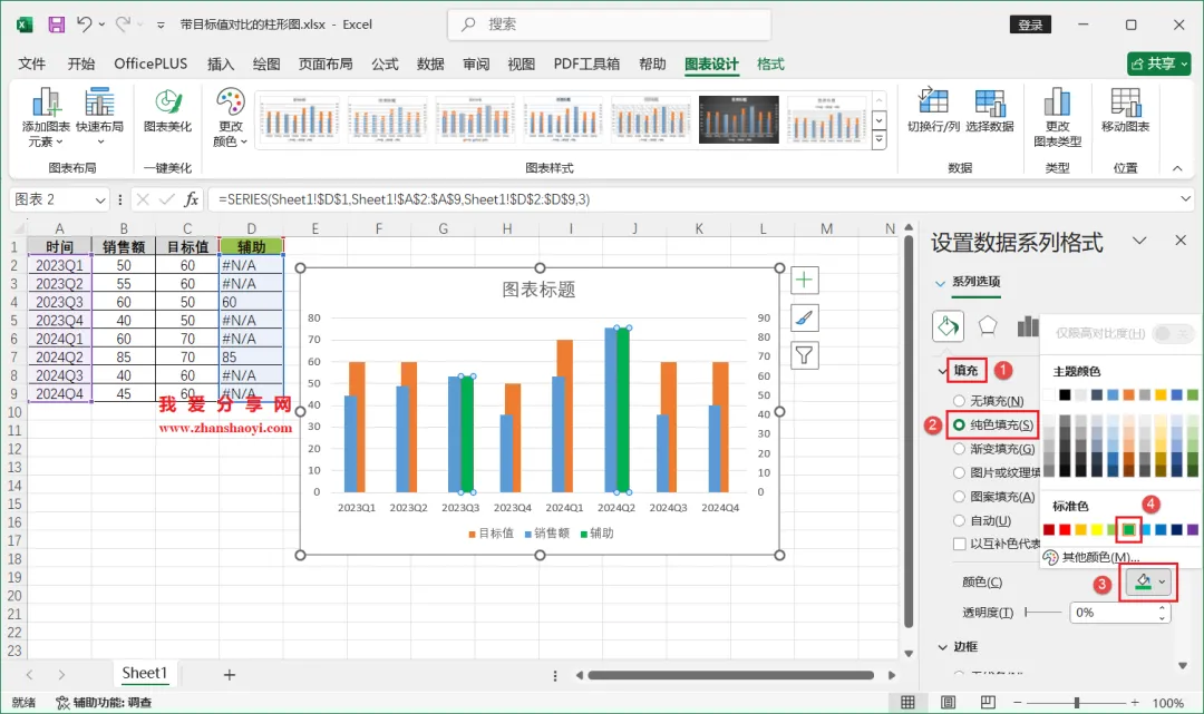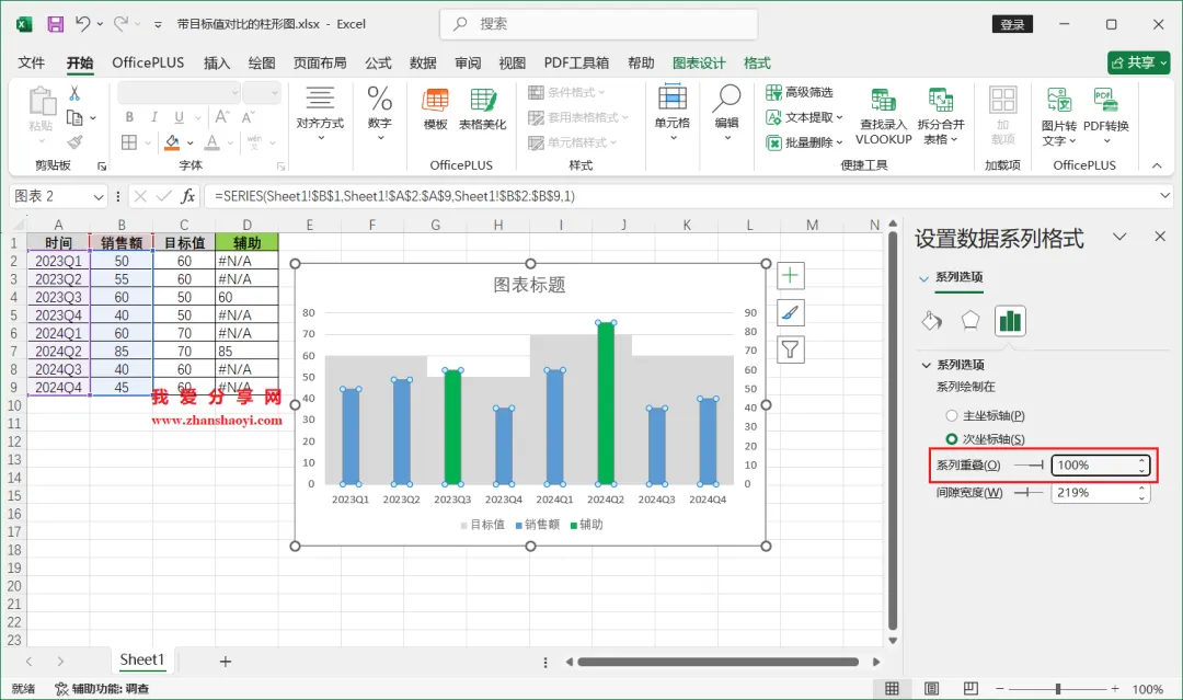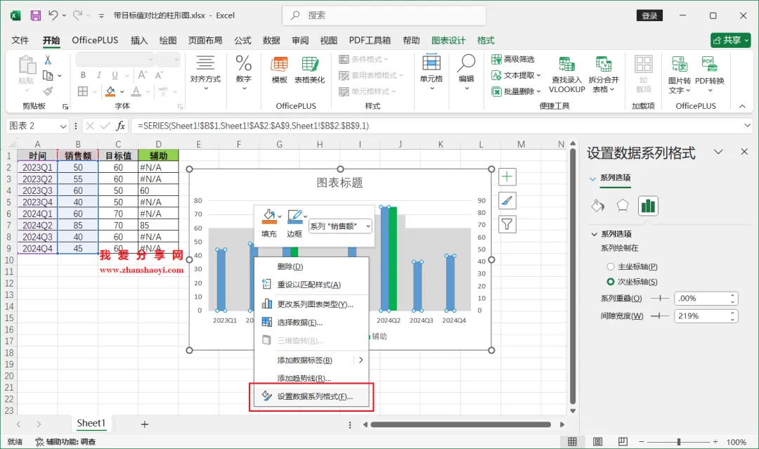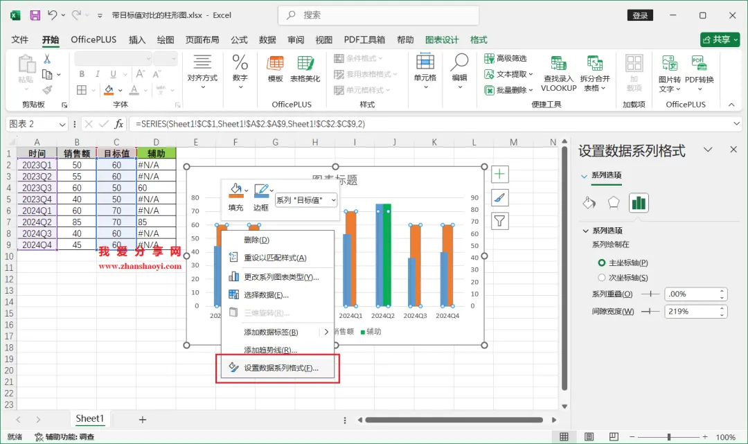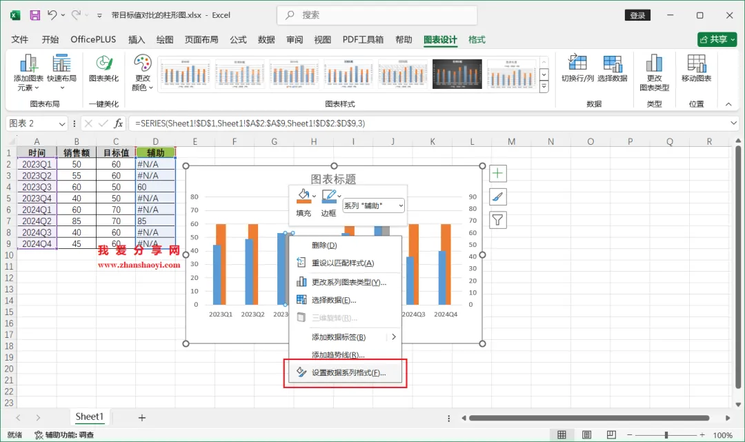 http://www.zhanshaoyi.com/24060.html7、第三步,修改需要「重点突出显示柱形」的填充色,鼠标右击辅助系列选择【设置数据系列格式】;