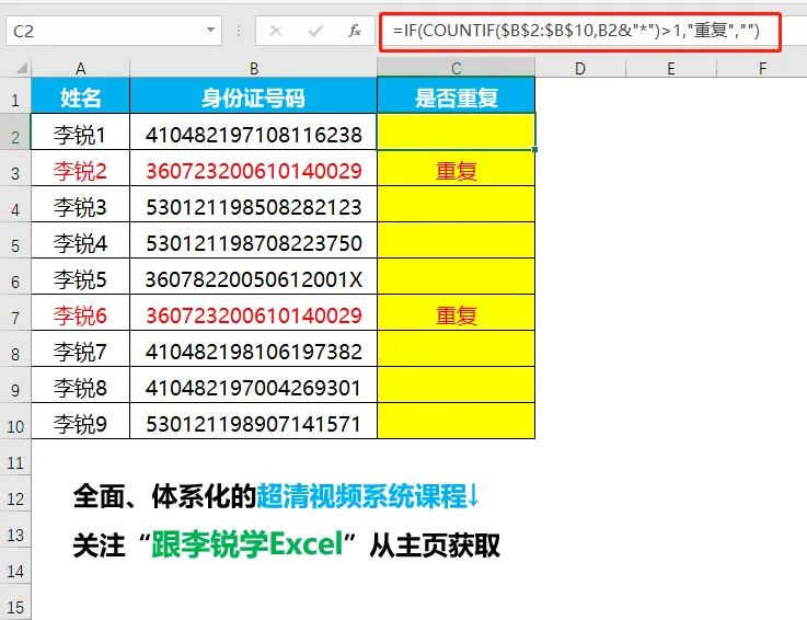 由于身份证号码长度达到18位,所以在公式中连接&"*"将其转换为文本格式进行识别判断;