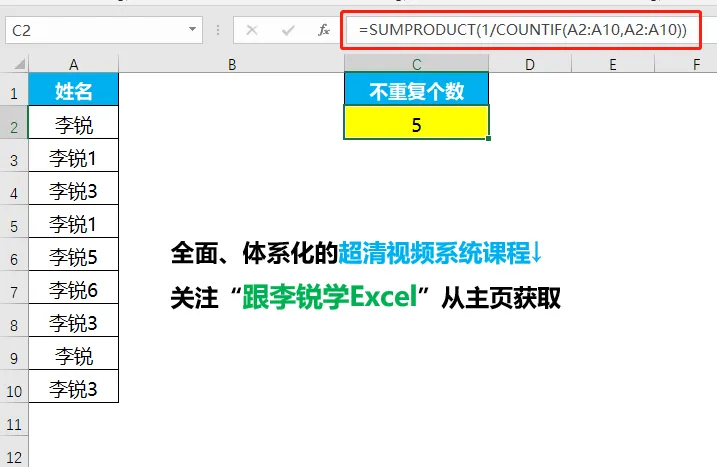 =SUMPRODUCT(1/COUNTIF(A2:A10,A2:A10))