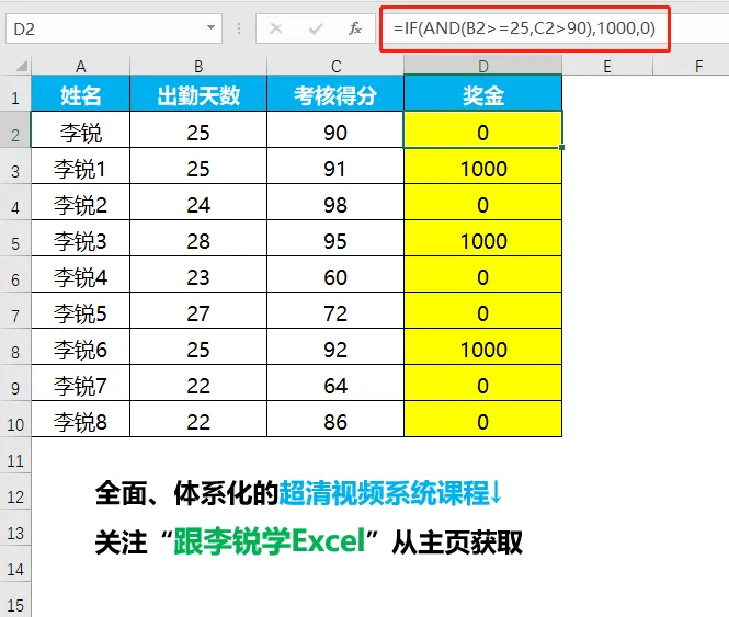 自动统计奖金,对同时满足出勤天数不低于25天,且考核得分90分以上的人员给予1000元奖金奖励;