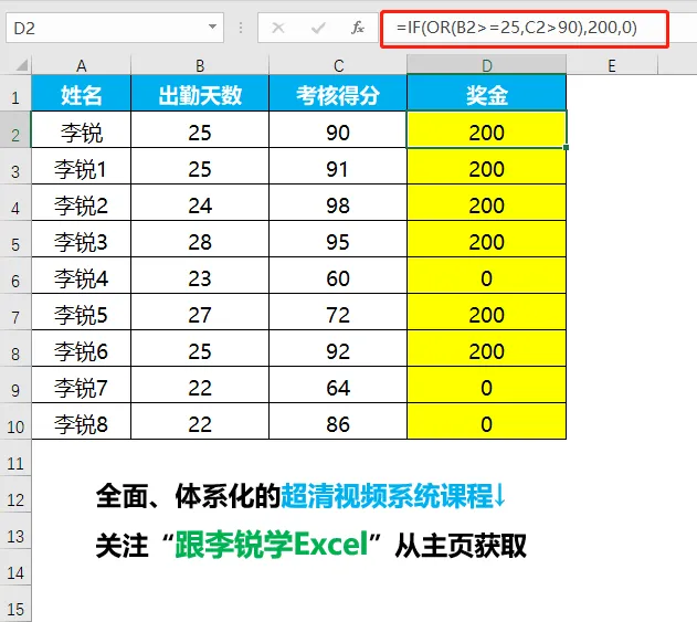 自动统计奖金,对任意满足出勤天数不低于25天,且考核得分90分以上这两个条件其中之一的人员给予200元奖金奖励;