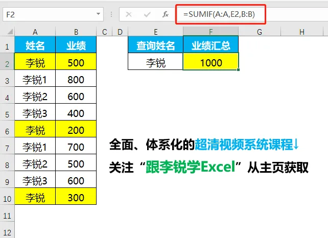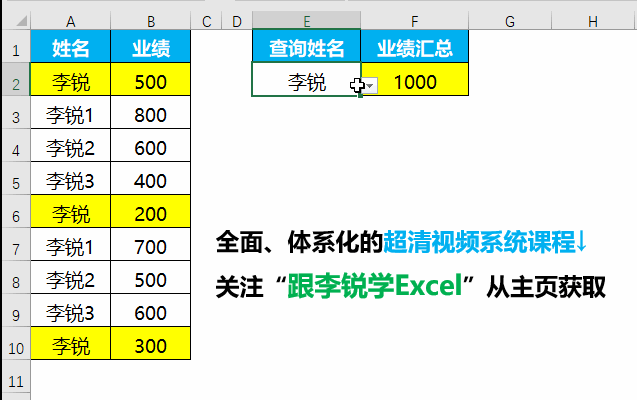要求按姓名统计其业绩汇总,如下图动图所示。