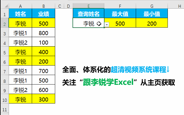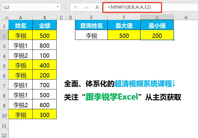 按姓名条件统计最小值,G2单元格输入公式: