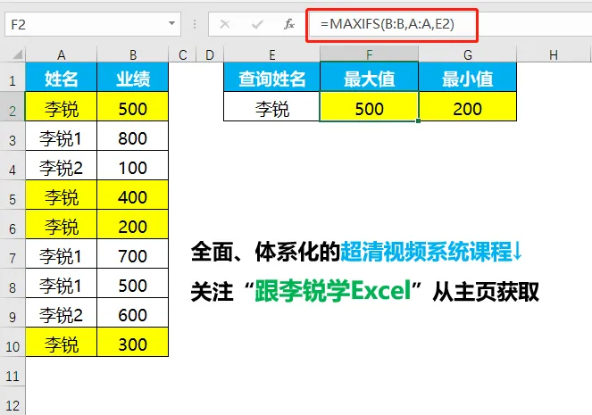按姓名条件统计最大值,F2单元格输入公式: