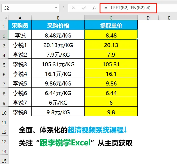 将其传递给LEFT函数从左侧提取数值,则得到单价;
