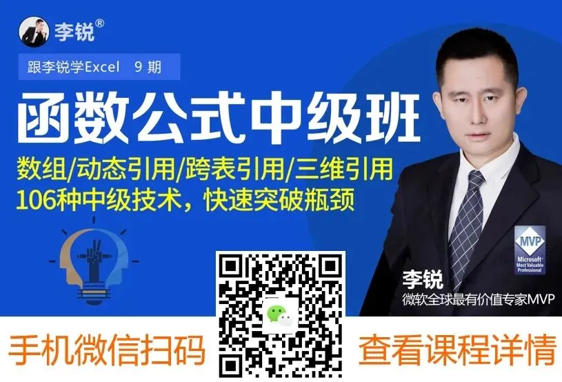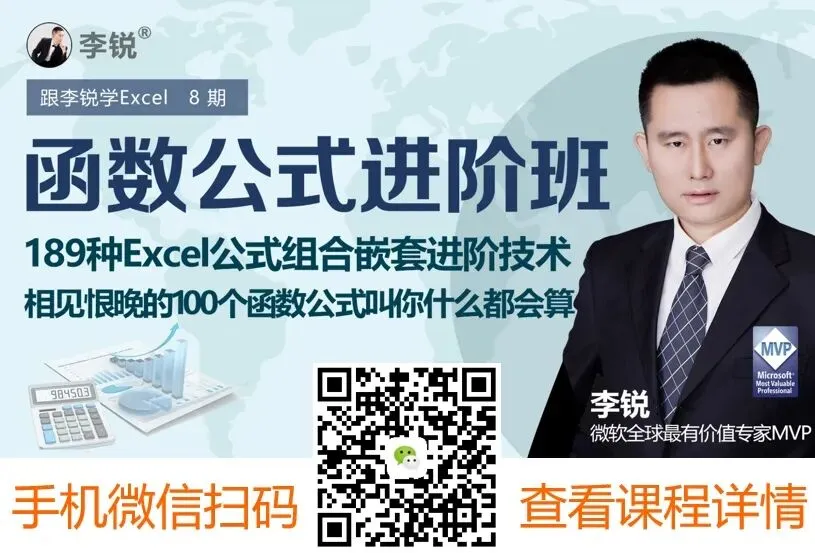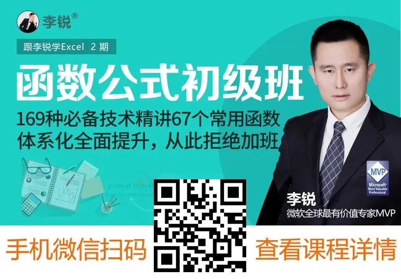 除了本文内容,还想全面、系统、快速提升Excel技能,少走弯路的同学,请搜索微信公众号“跟李锐学Excel”点击底部菜单的“知识店铺”或下方扫码进入