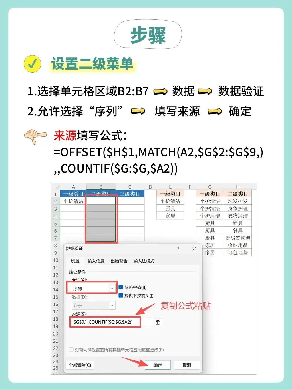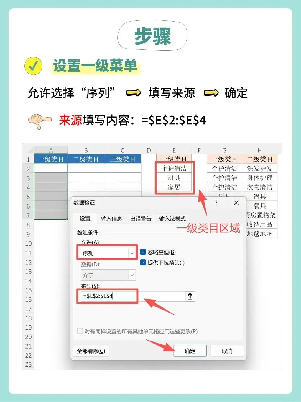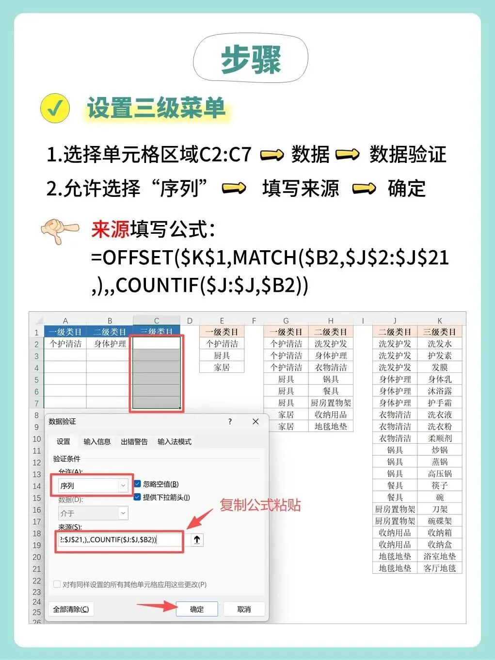 依次为每一级类目设置数据验证,并在“来源”中输入对应的公式;