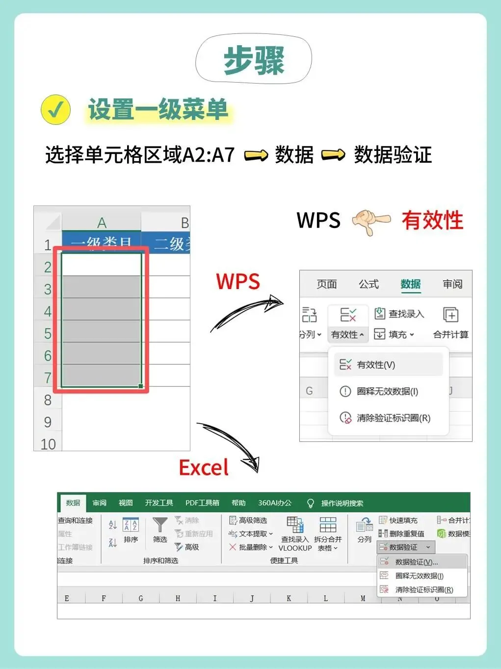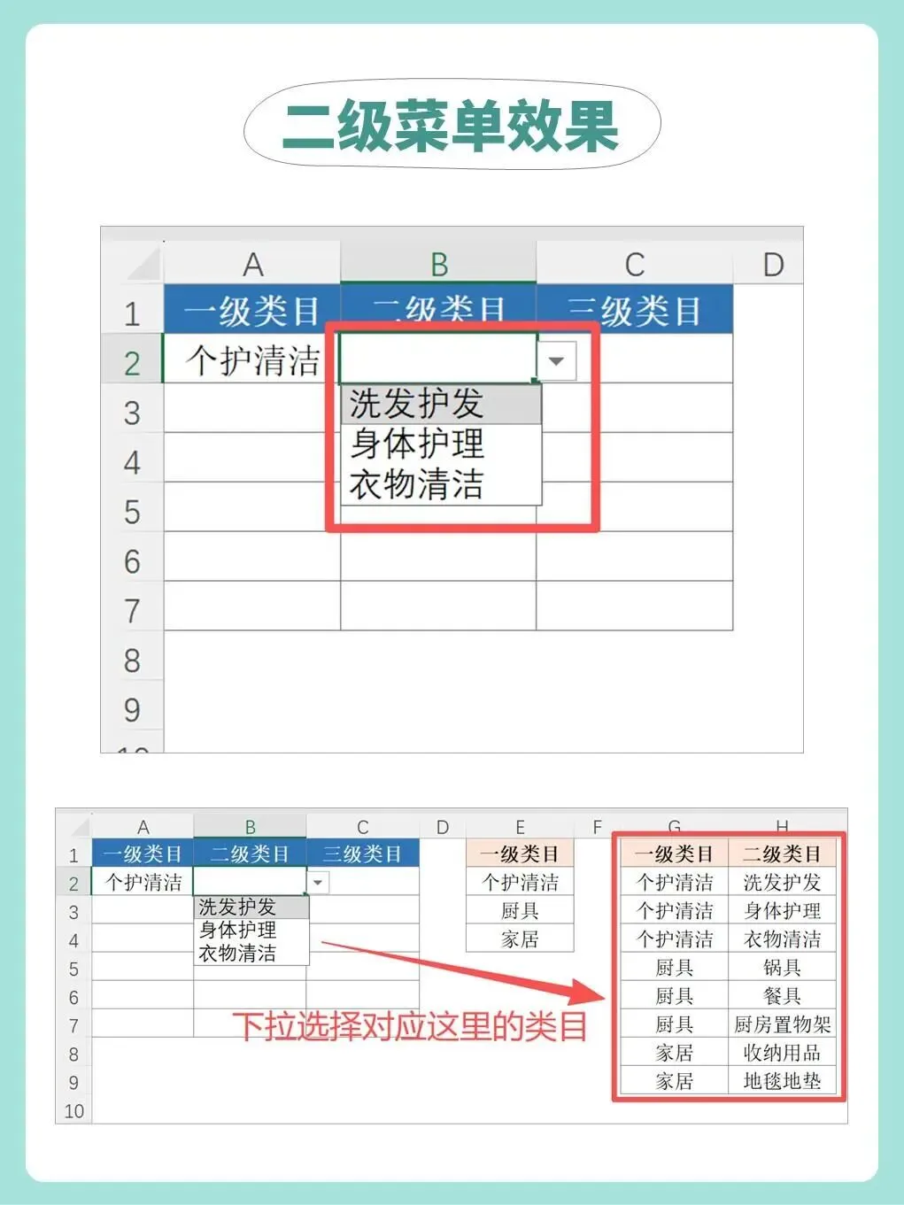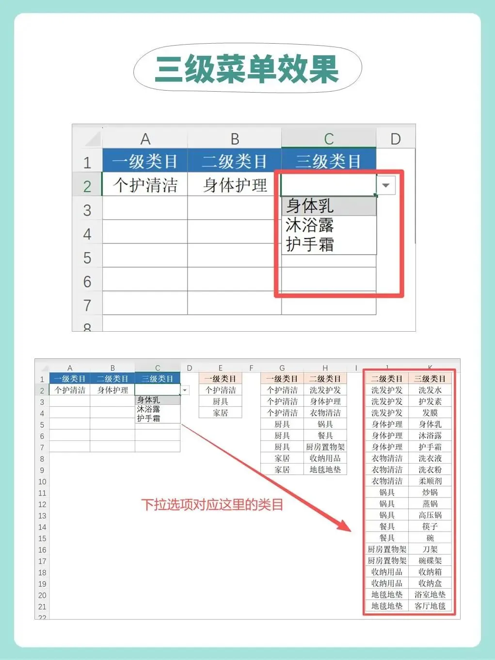 依次为每一级类目设置数据验证,并在“来源”中输入对应的公式;