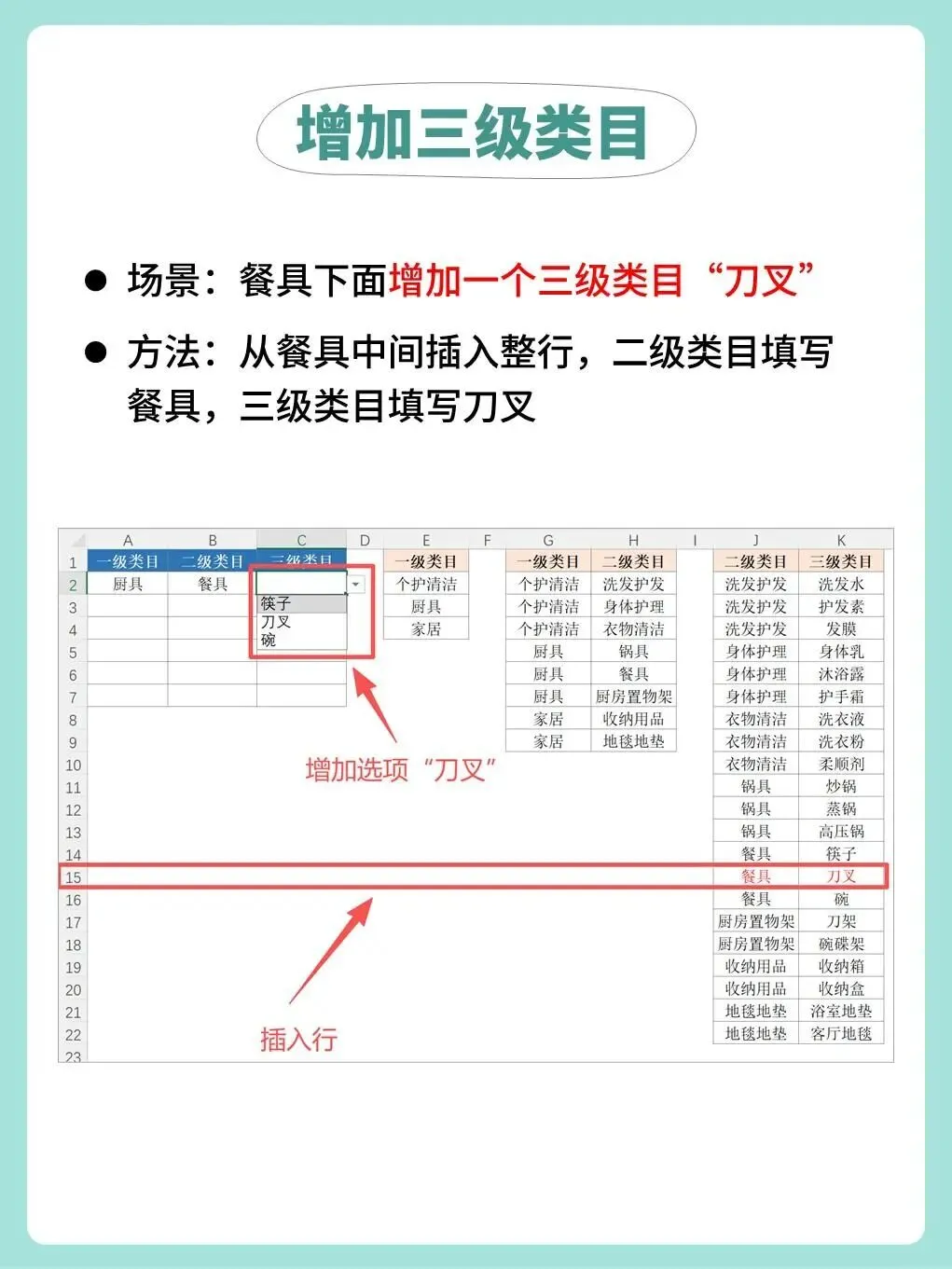 当商品类目中的一级、二级、三级选项较多时,手动输入容易出错。我们可以借助数据验证功能配合函数公式,实现快速准确的录入。