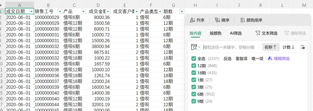 通过公式将“产品类型”和“期数”的信息提取出来