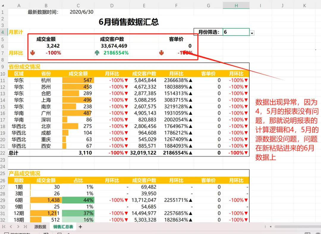 4,5月的数据和报表呈现都没有问题,说明原有的计算逻辑和数据引用是没问题的,那么问题就出现在新导入的数据上。