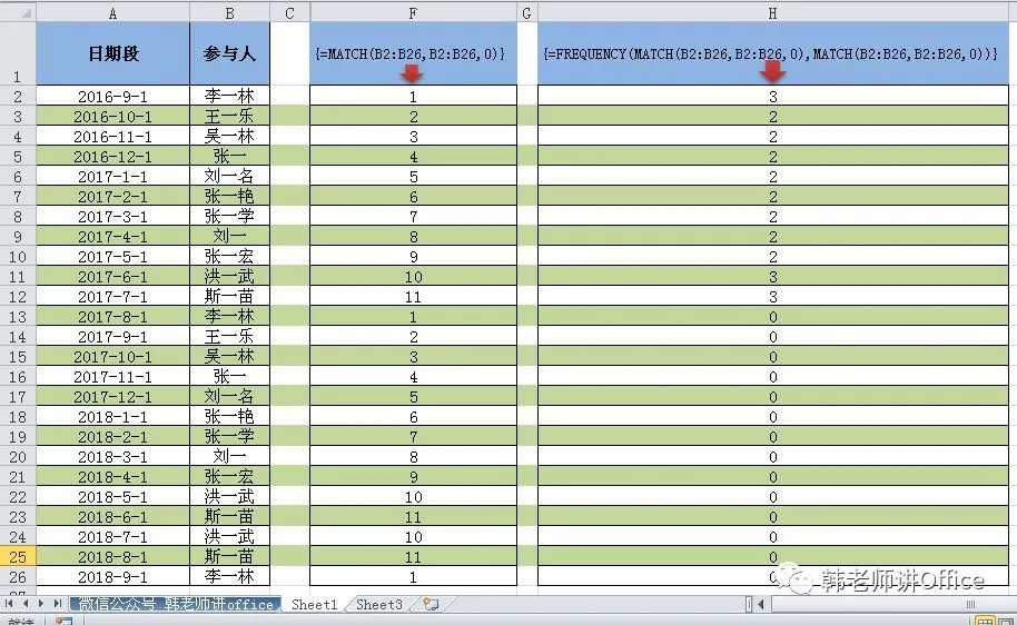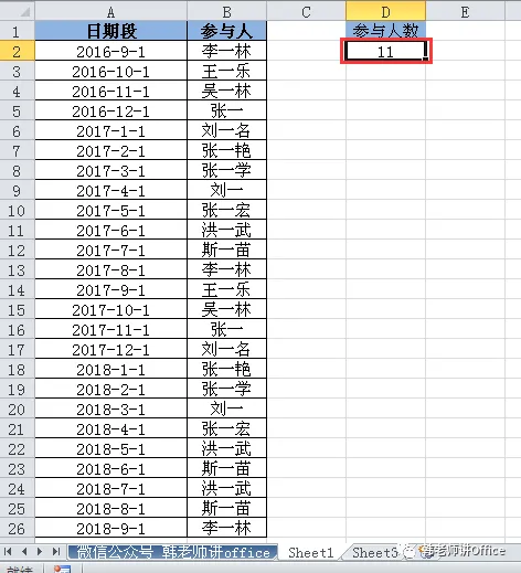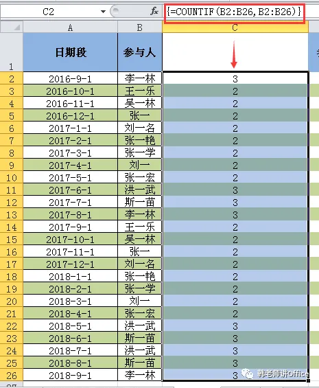 如下图,是用此公式得出的每个姓名出现的次数。