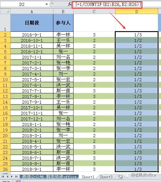 1/COUNTIF(B2:B26,B2:B26)得到如下数组: