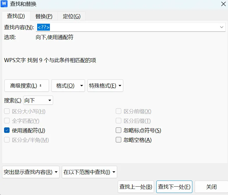 精准查找:按下Ctrl + F打开“查找”对话框。在查找内容框中输入:<??>(注意:尖括号和问号都是英文半角符号)。然后,点击“高级搜索”按钮,在展开的选项中,务必勾选“使用通配符”。接着,点击“在以下项中查找”,选择“当前所选内容”。此时,你会发现文档中所有两个字的姓名都被精准地选中了。