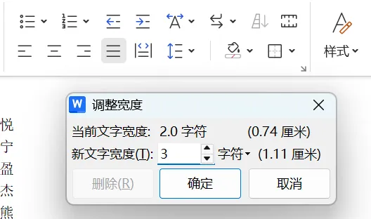 3.一键调整:保持两个字的姓名处于被选中状态,在Word顶部的“开始”选项卡中,找到“段落”功能组。点击“中文版式”按钮(图标是一个带左右箭头的字母A),在下拉菜单中选择“调整宽度”。在弹出的对话框中,将“新文字宽度”设置为 “3字符”,然后点击“确定”。