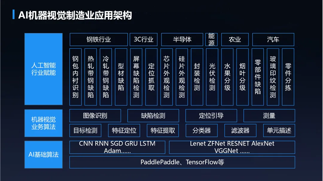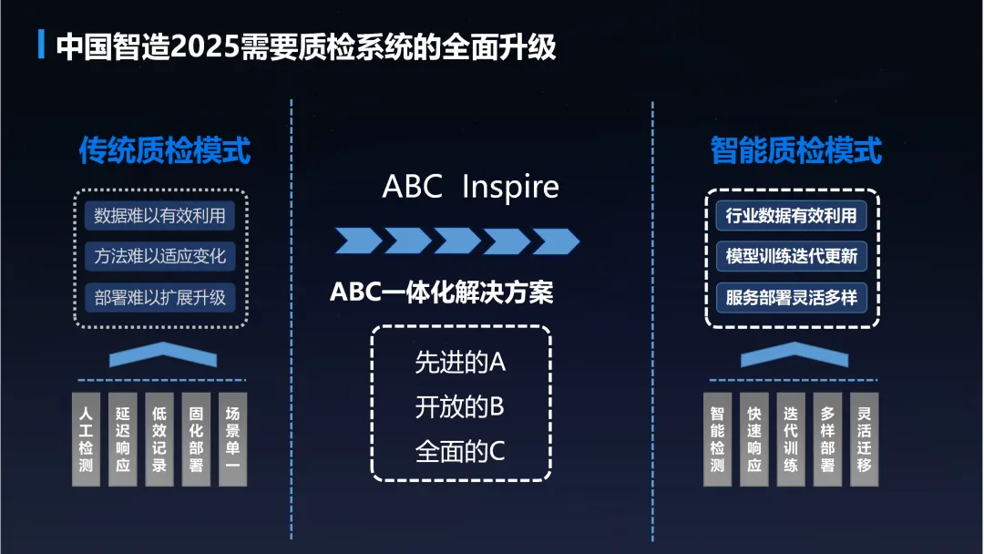 本方案全面阐述了人工智能技术在传统制造业转型升级中的应用框架与实施路径,聚焦于机器视觉与大数据分析两大核心能力,构建了覆盖质检、预测、优化等多场景的智能化解决方案。方案开篇回顾了人工智能技术发展历程与核心要素,强调算法、数据与算力的协同驱动。通过构建涵盖感知层、算法层、平台层与应用层的产品架构,形成从数据采集、处理分析到智能决策的全栈技术支撑体系,并依托领先的云基础设施与AI开放平台,为制造企业提供灵活可扩展的服务能力。针对传统制造业在质量检测环节存在的主观性强、效率低、成本高、数据利用率不足等痛点,方案提出了基于深度学习的智能质检模式。通过ABC一体化解决方案,结合机器视觉与业务算法,实现了对缺陷的高精度、自动化识别与分类,支持快速迭代与灵活部署。应用案例显示,在钢铁、3C、汽车零部件、农业等领域,系统缺陷检出率与分类准确率均达到99%以上,显著提升了质检效率与一致性。此外,方案构建了融合工业物联网与大数据的整体架构,将视觉检测数据与设备运行、工艺参数等多源信息相结合,不仅实现产品质量的实时监控与预警,更延伸至设备故障预测、生产工艺优化与生产智能调度等场景,推动制造过程向可预测、可优化的智能化方向演进。