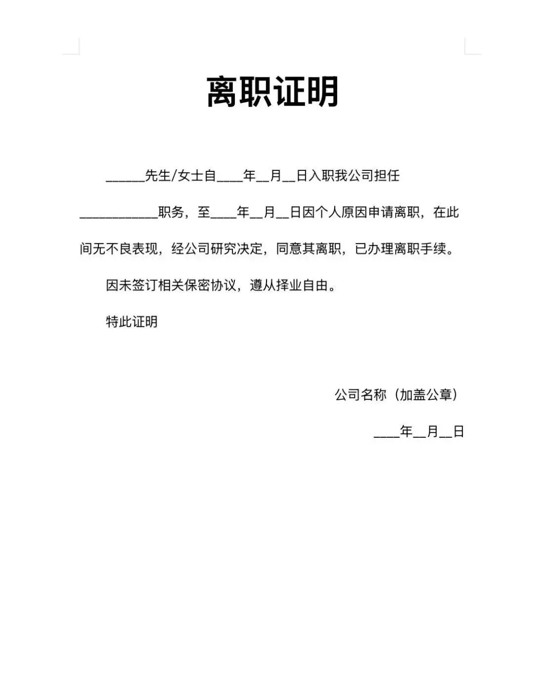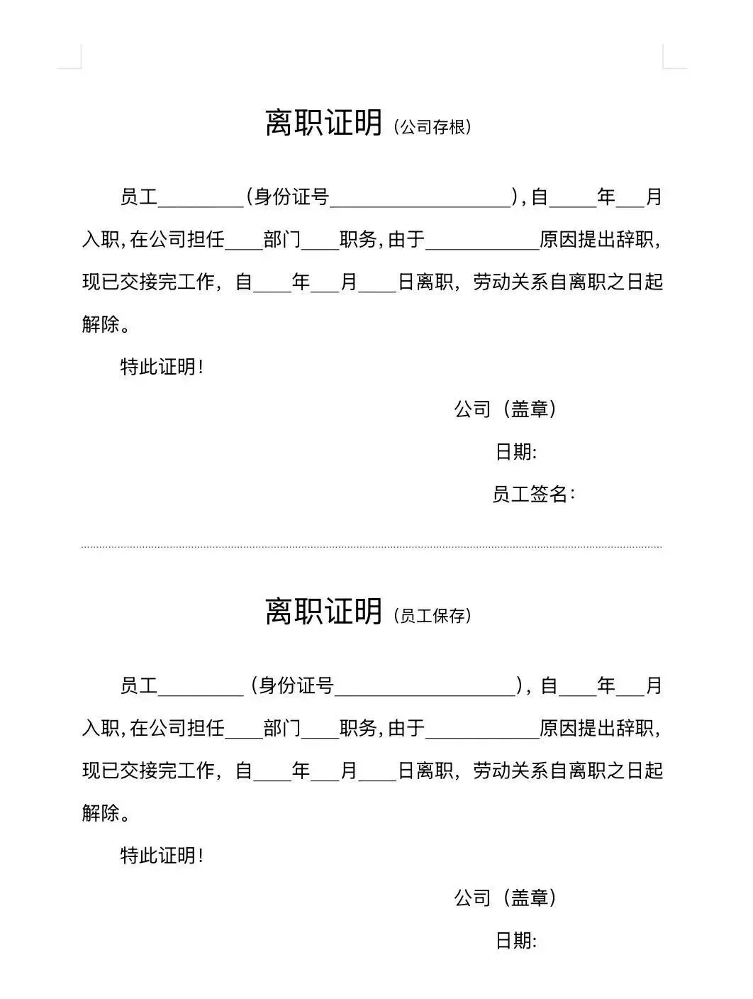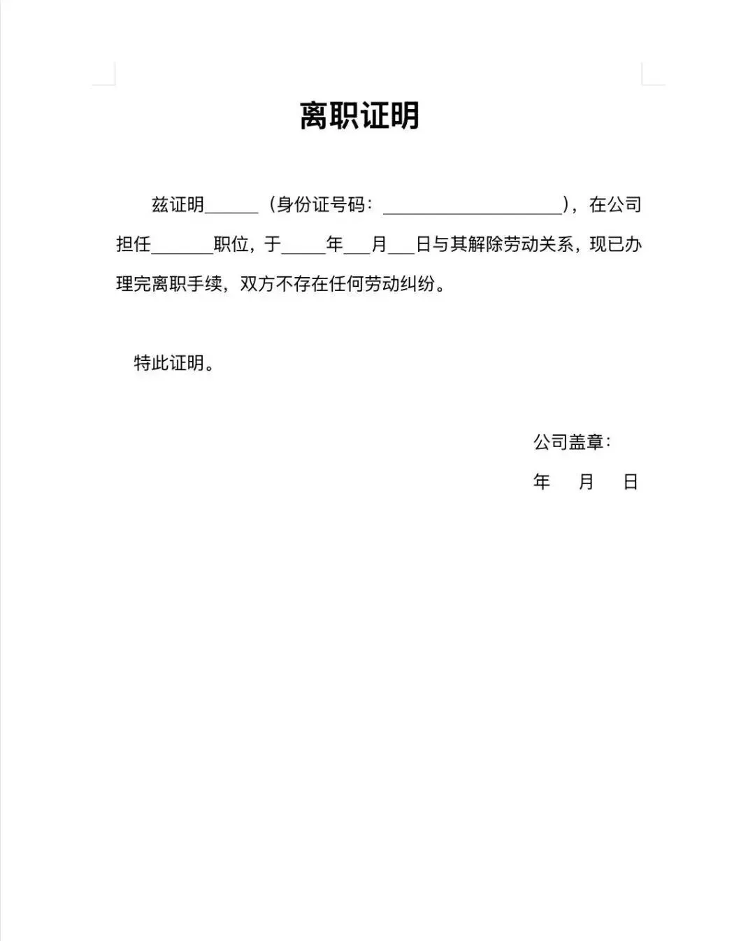 >员工离职证明word模板(免费保存)