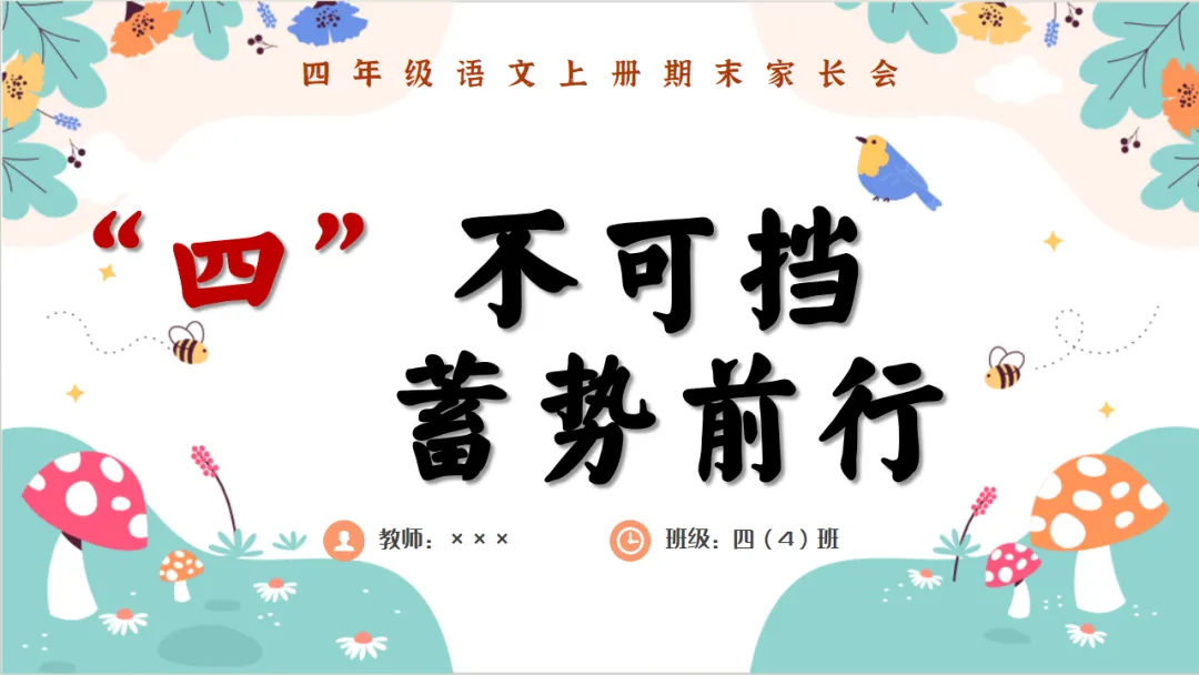 今天给老师分享 四年级语文上学期期末家长会:四年级期末总结,安全假期智慧充电,一场没有废话的家长会 的课件,ppt课件一共66页。课件无水印 ,可编辑修改。(文末有课件资料的获取方式)【四上】【语文】【“四”不可挡 蓄势前行】