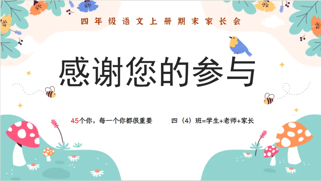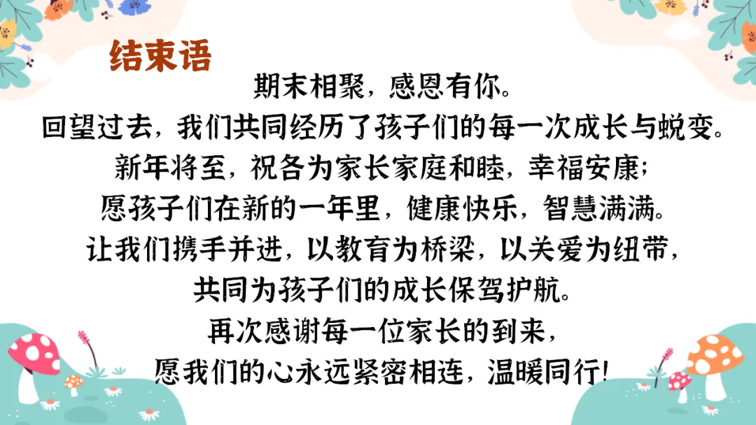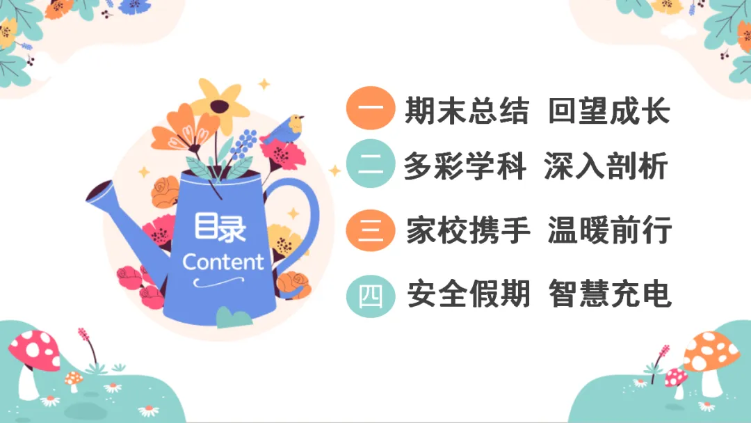 本次家长会,是我们回顾过往、展望未来的重要契机,主要内容有4大部分:01期末总结 回望成长;02多彩学科 深入剖析;03家校携手 温暖前行;04安全假期 智慧充电。