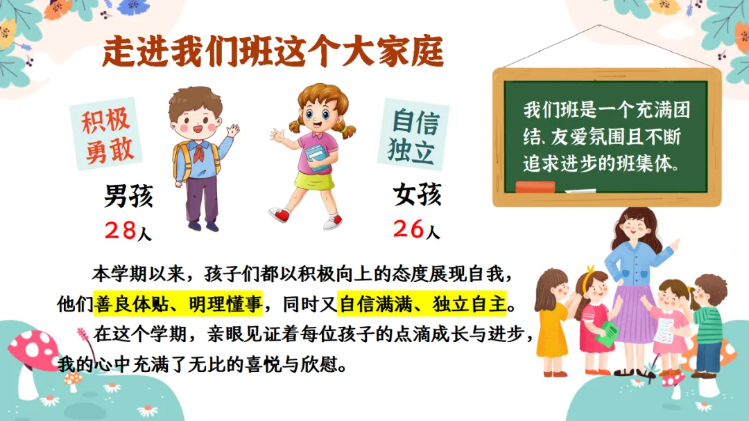 我们班是由46名宝贝组成的温馨的大家庭。我们是一个充满团结、友爱氛围且不断追求进步的班集体。其中包括23位活泼可爱的女生和23位勇敢坚毅的男生。本学期以来,孩子们都以积极向上的态度展现自我,他们善良体贴、明理懂事,同时又自信满满、独立自主。在这个学期,亲眼见证着每位孩子的点滴成长与进步,我的心中充满了无比的喜悦与欣慰。