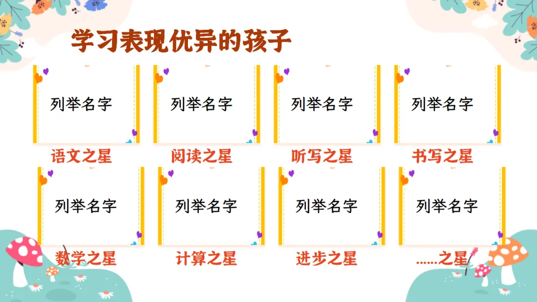 语文之星:列举名字;阅读之星:列举名字;听写之星:列举名字;书写之星:列举名字;数学之星:列举名字;计算之星:列举名字;进步之星:列举名字;......之星:列举名字...