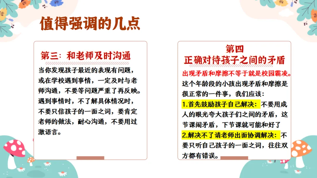 当你发现孩子最近的表现有问题,或在学校遇到事情,一定及时与老师沟通,不要等问题严重了再反映。遇到事情时,不了解具体情况时,不要只信孩子的一面之词,要肯定老师的做法,耐心沟通,不要用过激语言。