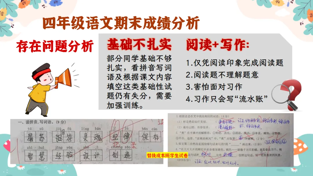 基础不扎实:部分同学基础不够扎实,看拼音写词语及根据课文内容填空这类基础性试题仍有失分,需要加强训练。