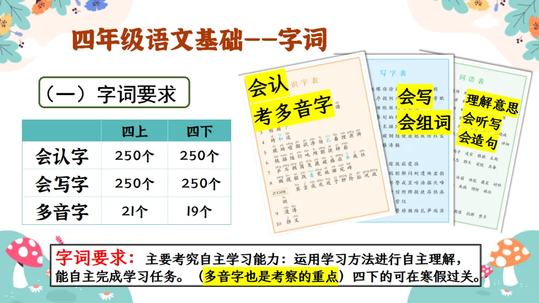 四上会认字250个;会写字250个;多音字27个。