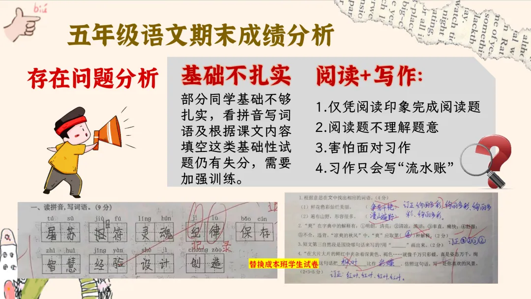 基础不扎实:部分同学基础不够扎实,看拼音写词语及根据课文内容填空这类基础性试题仍有失分,需要加强训练。