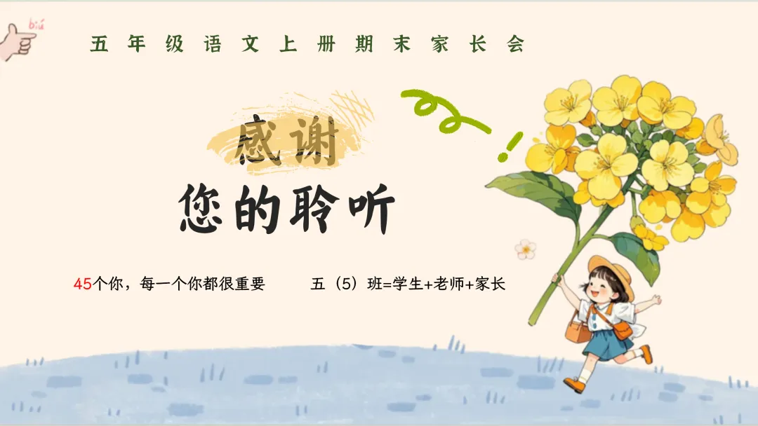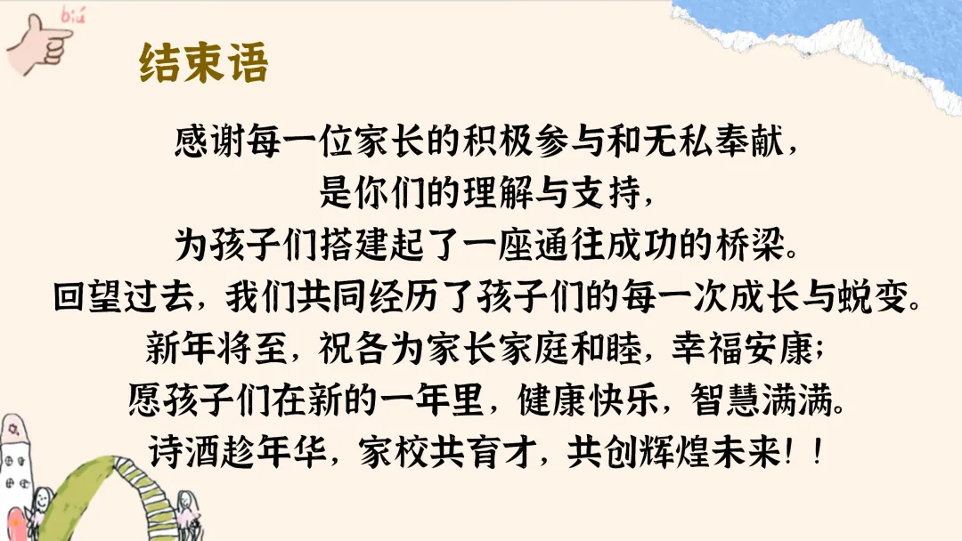 在这寒冬岁末之际,我们怀揣着对孩子们成长的热忱与期待,相聚于此,共赴这场以“五秋沃土一树繁花” 为主题的期末家长会。