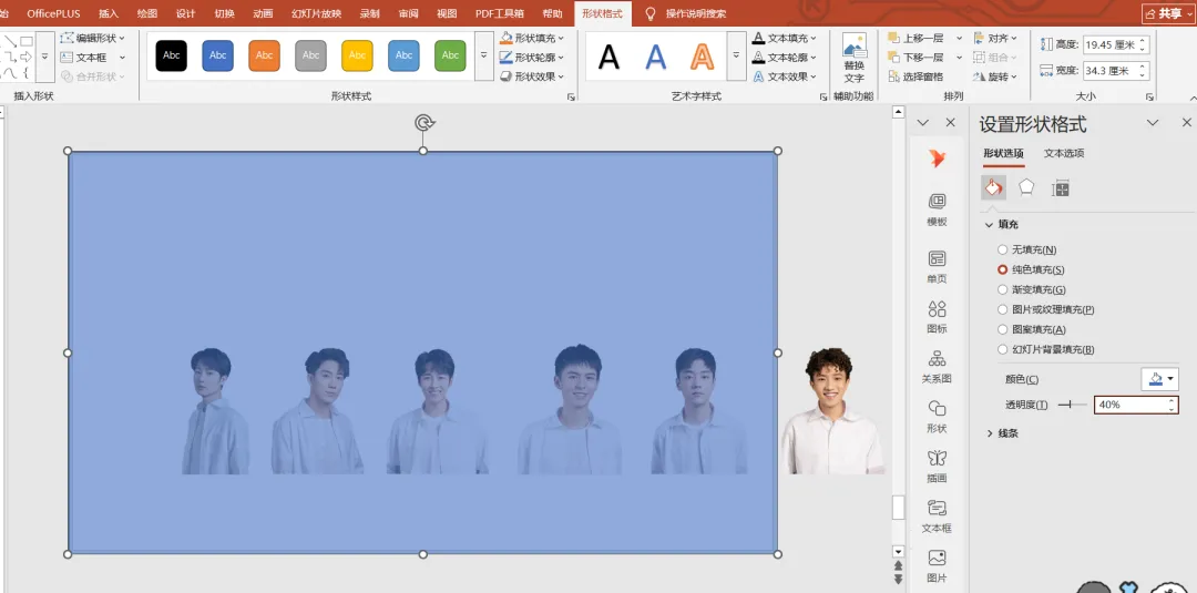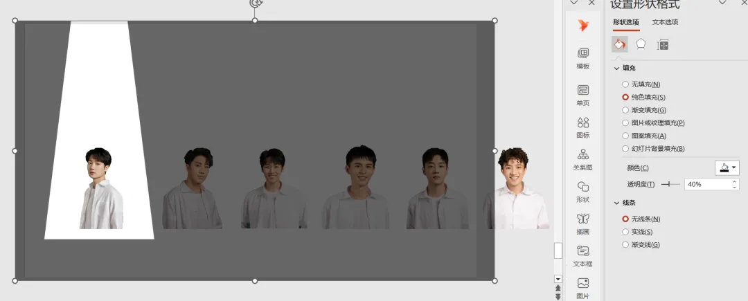 插入一个屏幕大小矩形,透明度设置为“40%”;