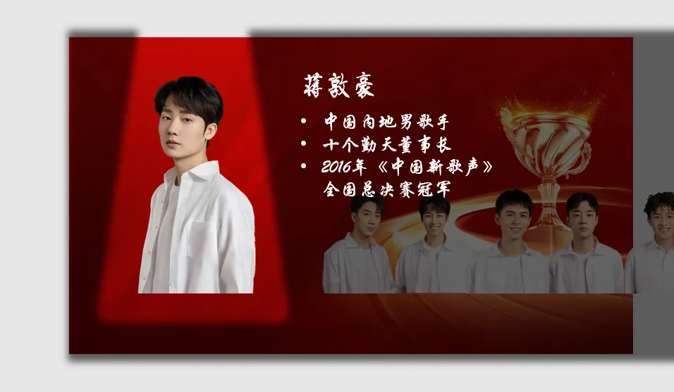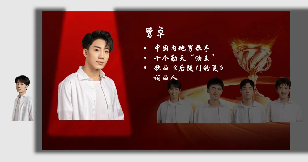 在花瓣网搜索舞台背景,填充、置于底层,放大要突出的人物,将其他人物往旁边缩小,添加人物简介;同样的方法完成后几个人物的介绍;