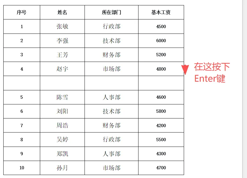 想在表格中间快速插入新行,不用再找“插入行”按钮。只需要将光标放到目标行的末尾,按下回车键,新行就会自动出现,位置精准又快捷。