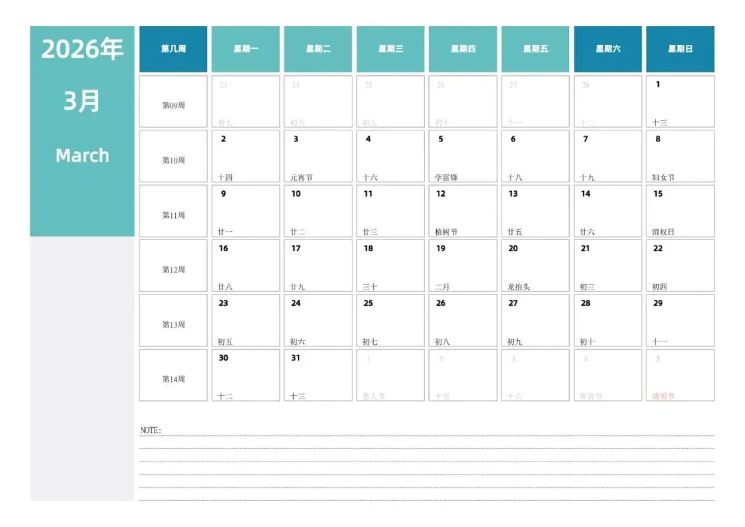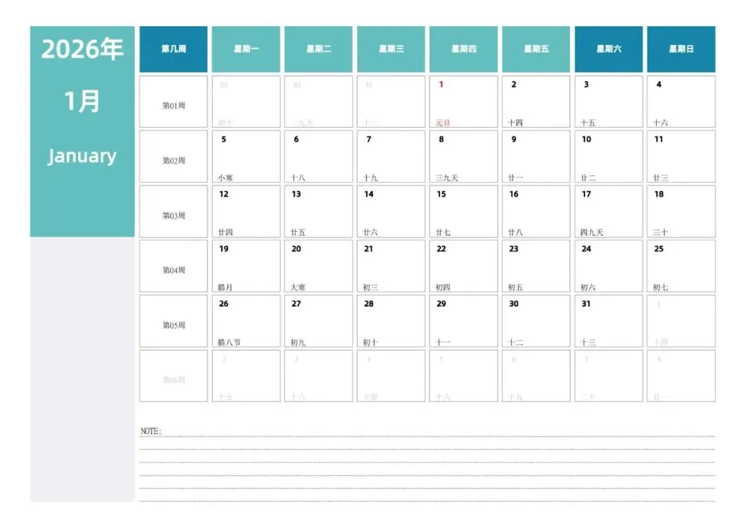 2026年日历全年表,word+excel,电子版可打印【含阳历农历阴历】