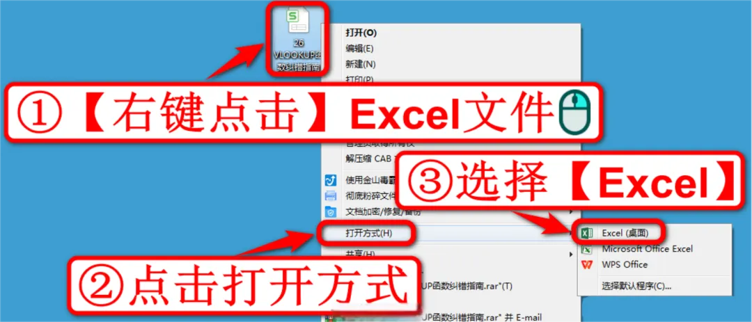 首先,一起打开前面下载的素材《26 VLOOKUP函数纠错指南》,鼠标右键点击Excel文件,点击打开方式,选择Excel,如下图:???温馨提示:本课程的学习操作统一使用Office2016,为了保证和小编相同的学习效果,请你也使用Office2016学习哦~如果没有相应的安装包,可以联系小编免费获得哦~