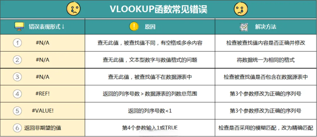 点开你会看到小编为你整理好的纠错指南,记录了VLOOKUP函数使用中常见的6种错误类型,分别列出了对应的原因和解决方法,今天完成学习后,你可以将这份口诀收藏,留着备用哦~如下图: