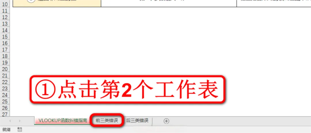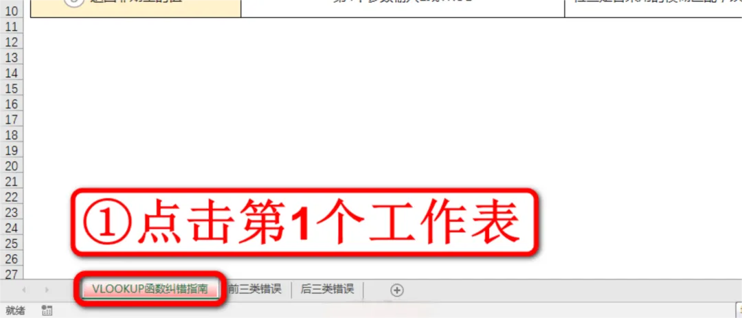 打开Excel文件后,鼠标左键点击左下角的第1个工作表VLOOKUP函数纠错指南,如下图:
