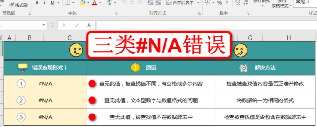首先我们来了解第一类错误#N/A错误,这类错误可以归类为查无此值的错误,常见的原因是被查找值输入错误、被查找值格式不同、被查找值不在查找范围,如下图: