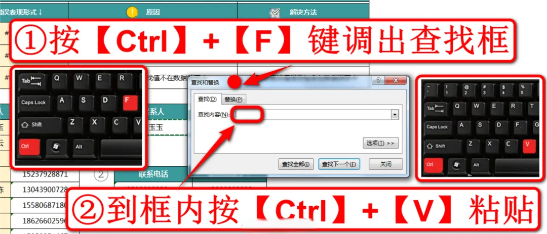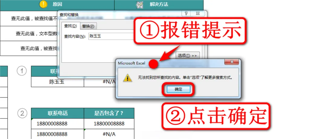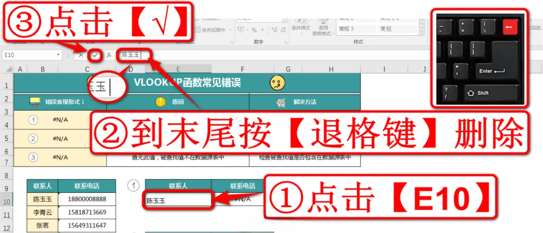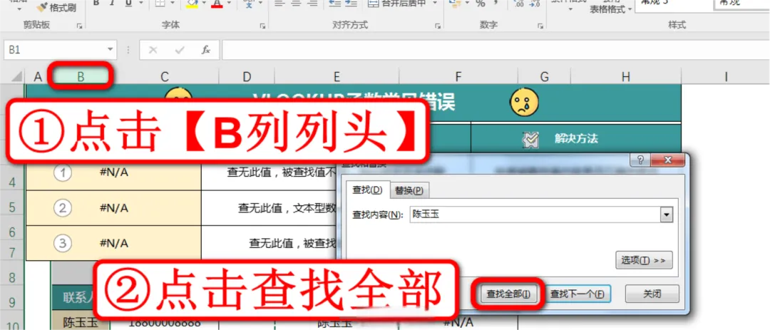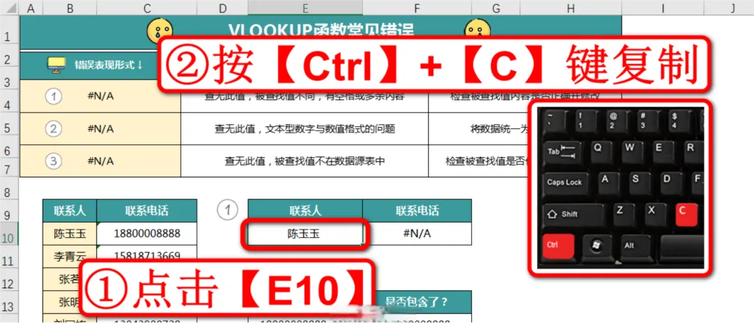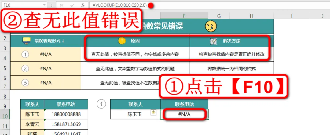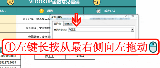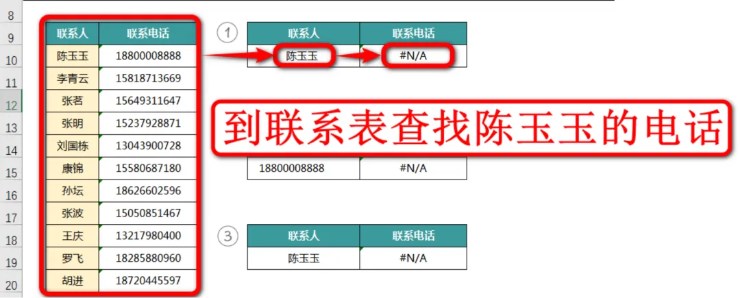 现在我们来纠正第一个错误案例,这里的案例是要在左侧的联系人及电话表格中查找陈玉玉的联系电话,如下图:
