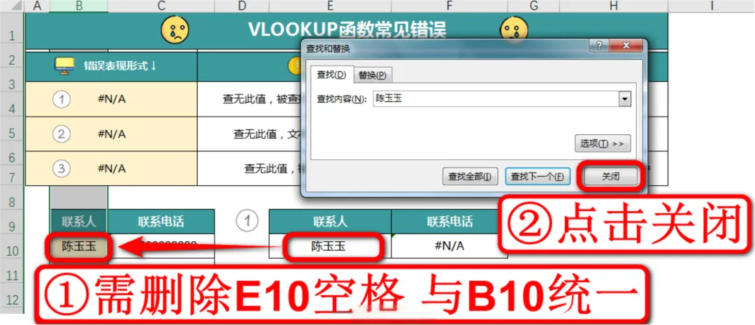 因为存在空格导致VLOOKUP无法将E10单元格和B10单元格识别为相同的文本,因此你要将E10单元格的空格删除,先点击关闭把对话框关闭,如下图: