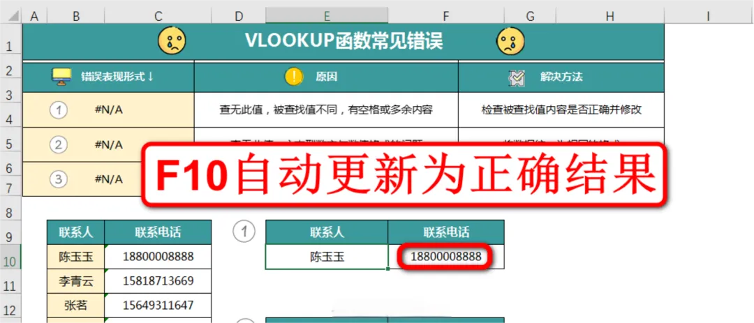 此时F10单元格自动更新,查到了准确的联系电话,如下图: