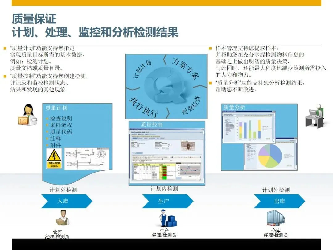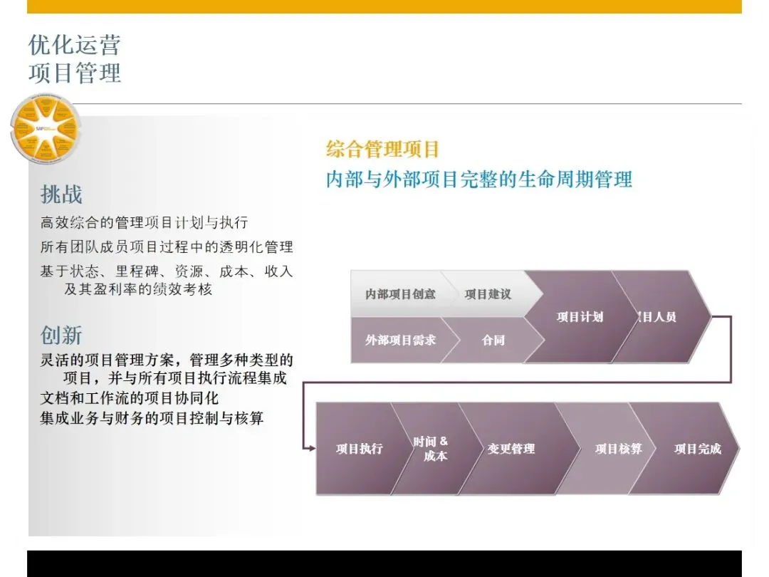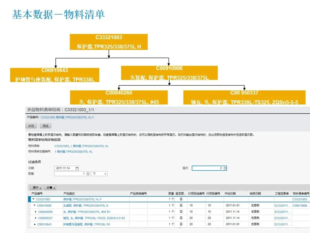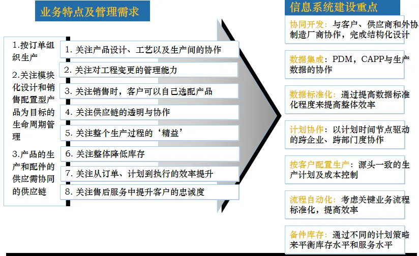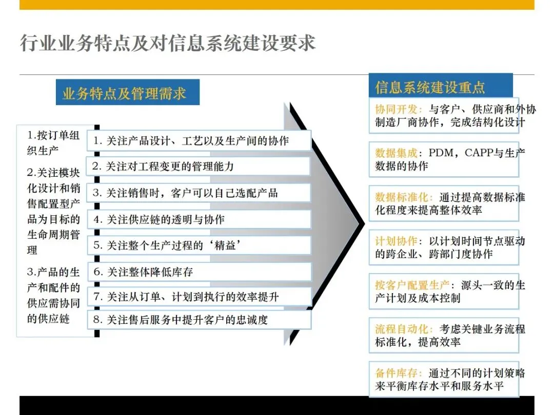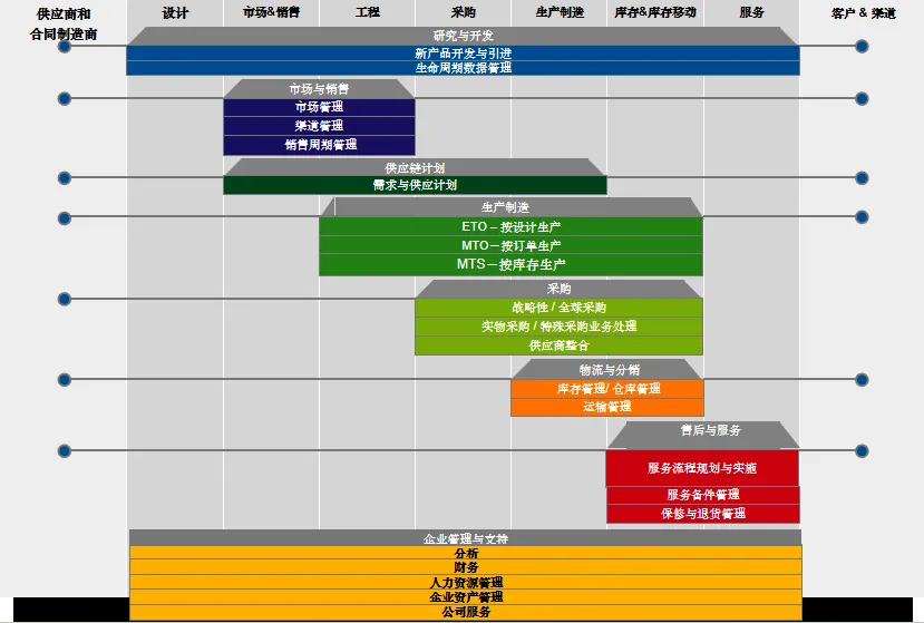 解决方案覆盖了整个行业过程的关键环节,支持模块化设计和全寿命数据管理的R&D设计阶段,打通了PDM和CAPP与制造之间的数据通道,满足了客户对个性化产品的R&D需求;生产流程与ETO、MTO、MTS三种生产模式兼容,实现了工单管理、物料对齐查询和批次跟踪,实现了生产流程的透明和控制。在供应链管理中,建立需求规划,全球采购,库存优化,物流配送的协同系统,支持企业间和部门间的规划联系;售后服务通过订单管理、备品备件管理和现场维护等来提高顾客的忠诚,并能够引发诸如回头客之类的后续商业活动。