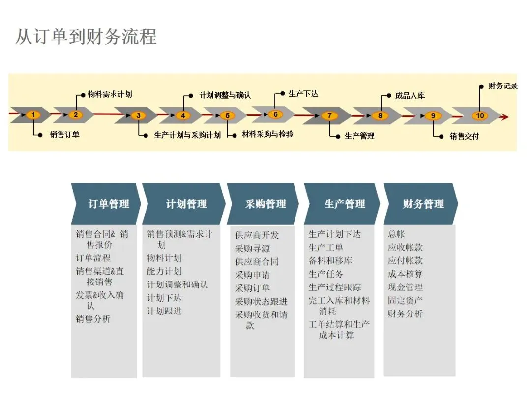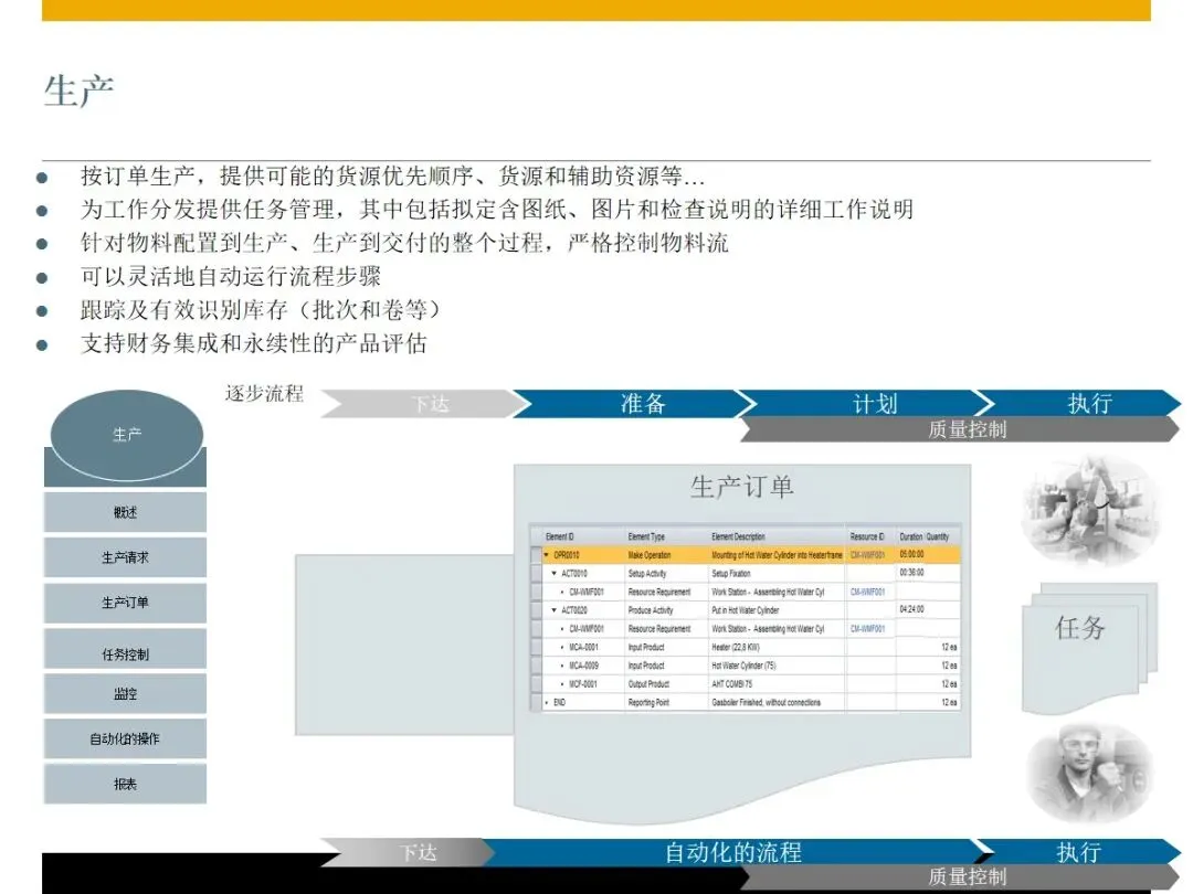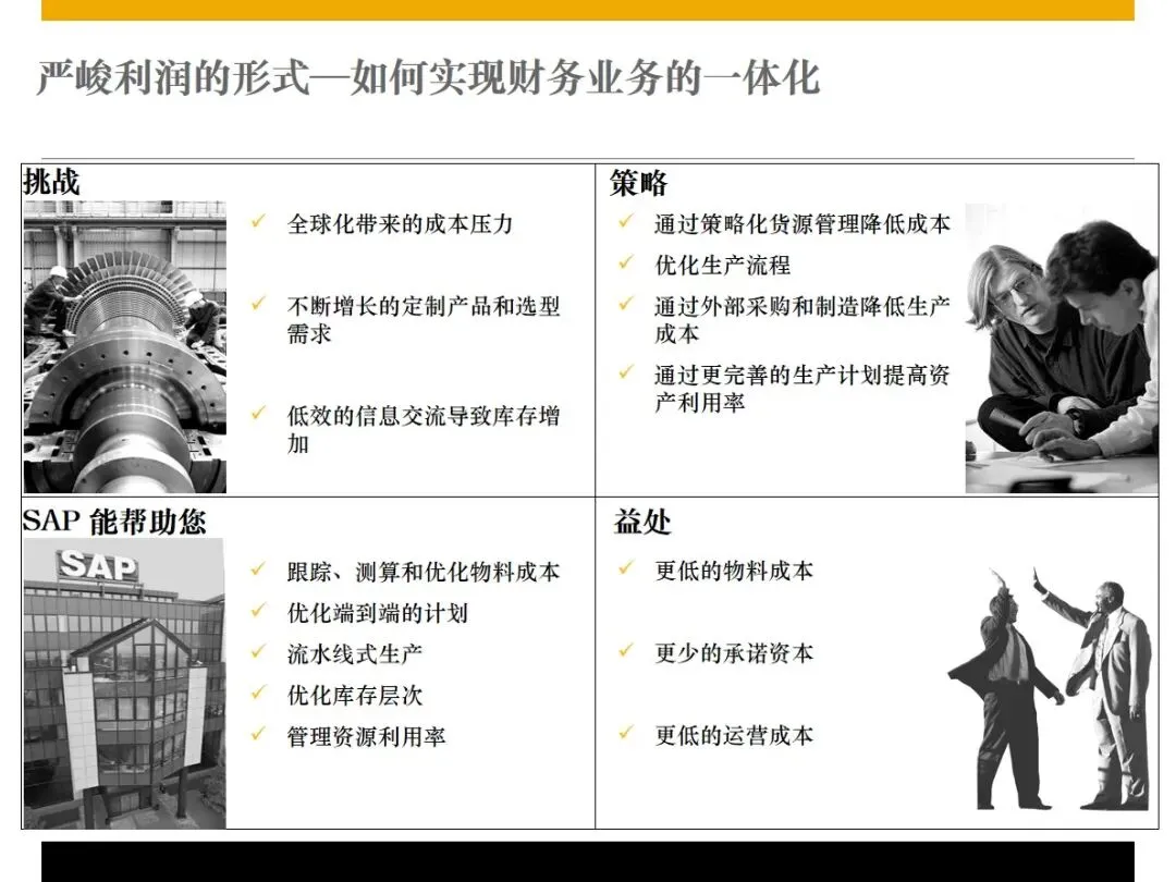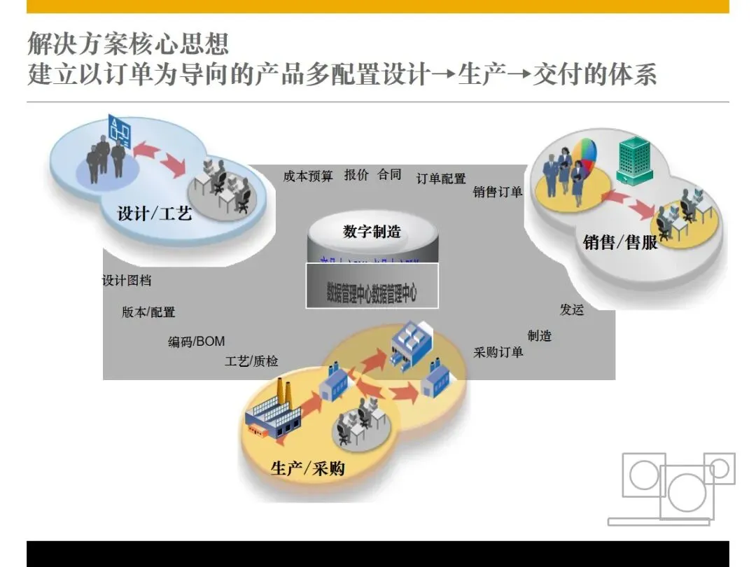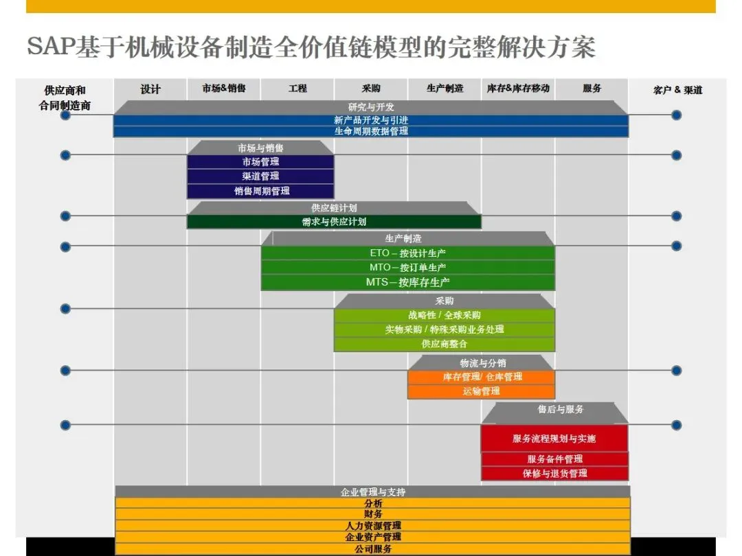 SAP机械制造行业解决方案,围绕“订单导向”的理念,建立了面向多配置的设计、生产和交付集成系统,满足了精益生产和协同高效的需求,并将其应用于整个价值链的数字化整合。