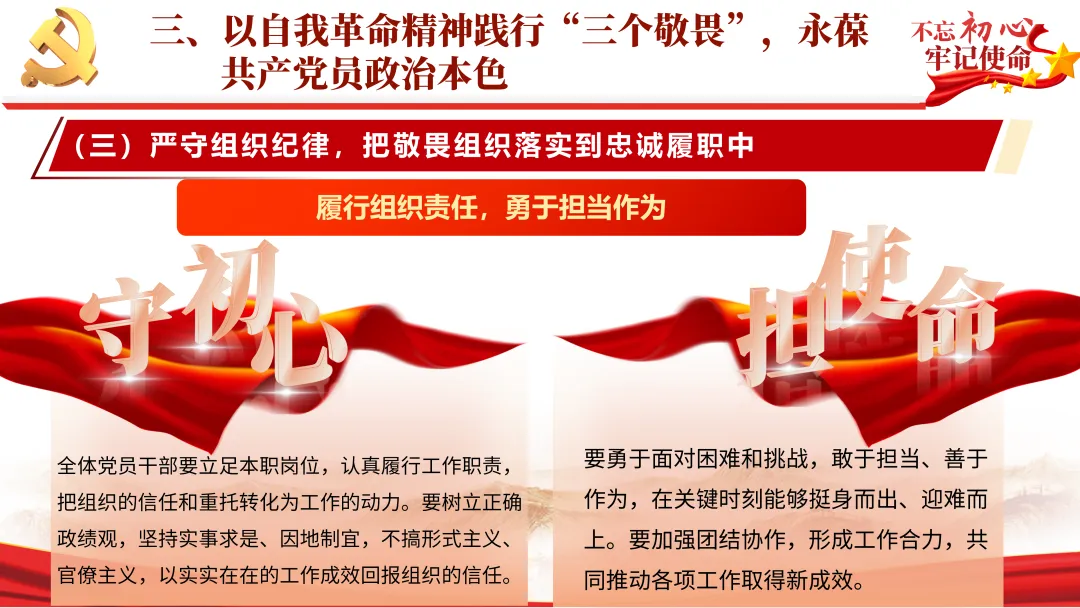 无论是强化理论武装、践行为民宗旨,还是严守组织纪律、筑牢廉洁防线,党课都给出了具体指引。对于党员干部而言,这既是一次思想洗礼,更是一份行动指南。读懂 “三个敬畏”,方能在干事创业中不偏航、不掉队,以优良作风为现代化添砖加瓦。