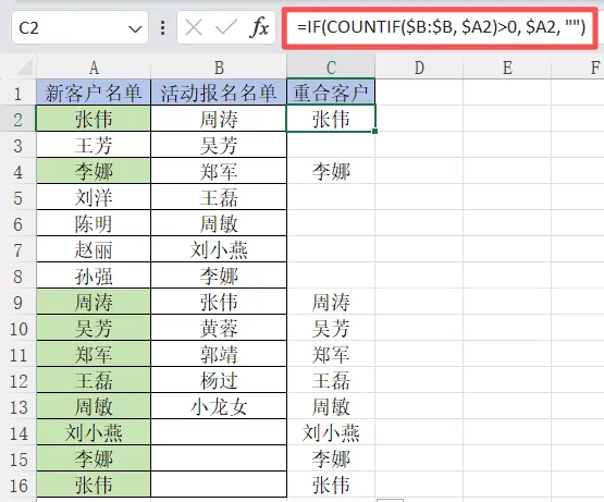 并将公式向下填充,C列瞬间出现了我们想要的结果:所有重复的姓名都被提取了出来,而非重复的姓名对应位置都是空白。像“张伟”、“李娜”、“周涛”等都乖乖地列在了C列。如下图:公式逐层解读: