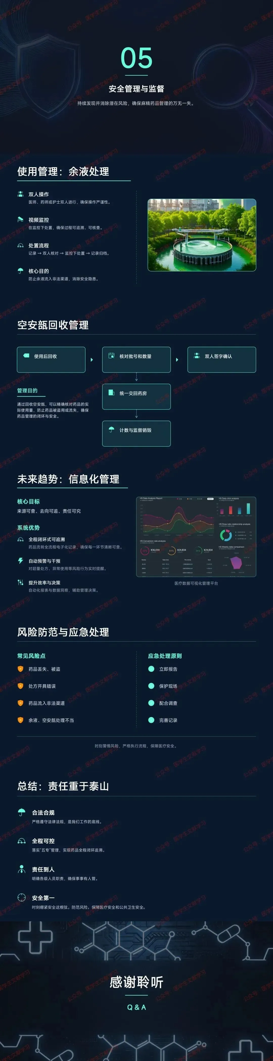 - 常见风险:药品丢失 / 被盗、处方错误、非法流转、余液 / 空安瓿处理不当。