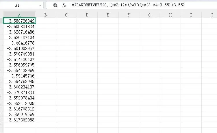 若RANDBETWEEN(0,1)生成1,RAND()生成0.5:计算过程:(1*2-1) * (0.5*0.09 + 3.55) = 1 * (0.045 + 3.55) = 3.595(正数)