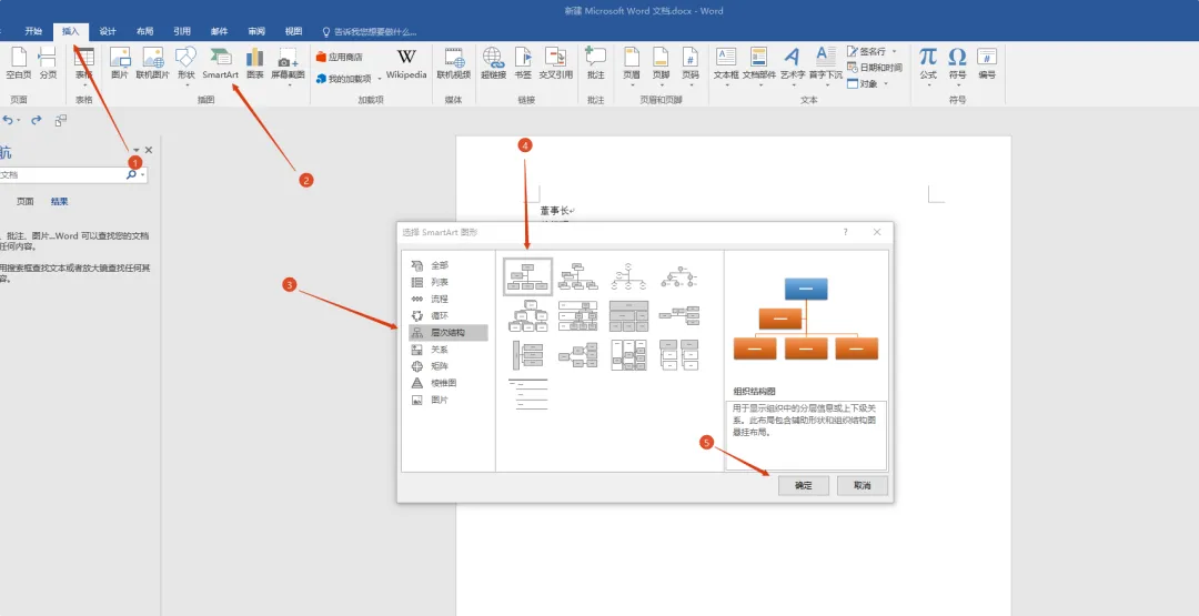 在弹出框”选择Smart Art 图形“弹框中选择”层次结构“中的”组织结构图“,按下”确定“按钮